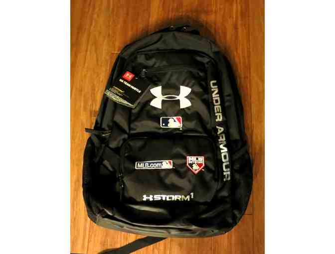 Under Armour MLB logo backpack. Adjustable shoulder straps, two side water bottle pockets, water repellant finish.