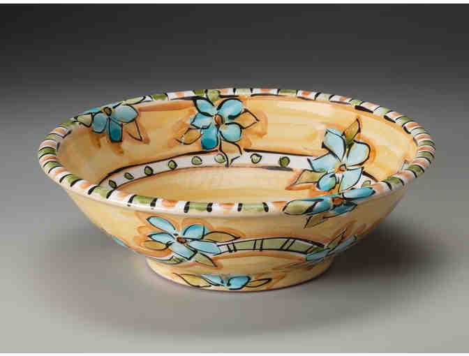 My work is Maiolica, an in-glaze hand painted tin glaze technique. I make functional pots and tiles that are meant to celebrate the day. My individual wall pieces and compositions of tiles are hand built and decorated with colorful, loose brushwork. I draw from every day scenes and objects for my imagery. Capturing the color and movement of the moment is my aim...the flowers in my garden trembling in a slight breeze and the sun glowing through them, or the light coming in the window and lighting the room.