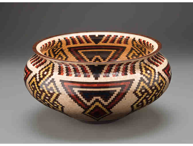 Made with Maple, Wenge, Yellowheart, Bloodwood and blue colored wood. This bowl has 5,689 pieces with each row having 144 pieces. Between the design and build this bowl took over 80 hours to make.