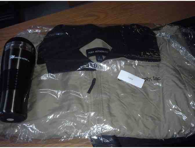 Dress for success when representing Griffin Supply- a leading supplier of Pipe, Valves, Fittings, Mechanical Tube, and Commercial Awning Fabric. This large 'Port Authority' brand jacket is made of durable material and also comes with a complimentary tumbler with the Griffin Supply logo on it.