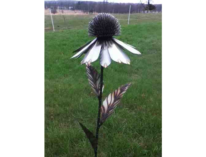 Custom designed Coneflower metal sculpture, designed by Kirk Yazal Metal Sculpture... sticks into ground and is self-supporting. Stands 42" tall after it is in the ground.