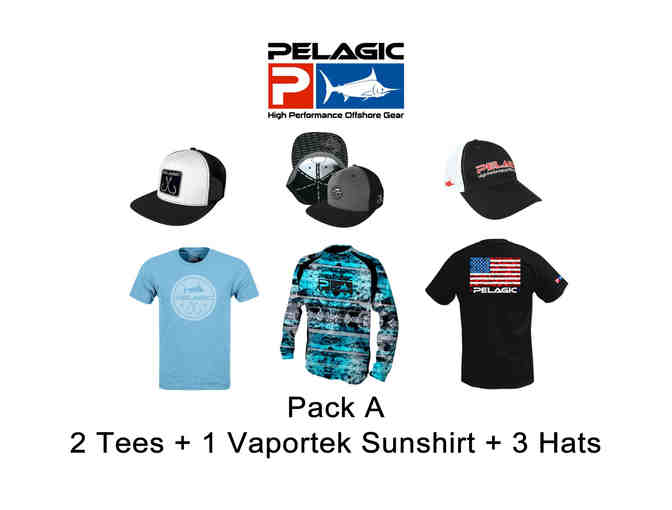 A favorite of sports fishermen, Pelagic offers high performance offshore sports gear. You will receive 2 Tees, 1 sunshirt, and 3 coordinating hats.