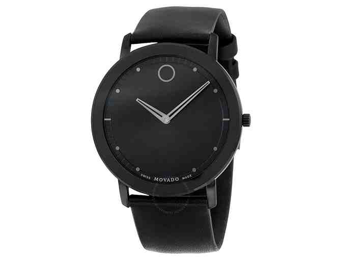 Black PVD stainless steel case with a black leather strap. Fixed black PVD bezel. Black dial with cabochon index hour markers. Minute markers around the outer rim. the movado dot appears at the 12 o'clock position. Dial Type: Analog. Quartz movement. Scratch resistant sapphire crystal. Pull / push crown. Solid case back. Case size: 40 mm. Case thickness: 11 mm. Round case shape. Band width: 19 mm. Band length: 8 inches. Tang clasp. Water resistant at 30 meters / 100 feet.
