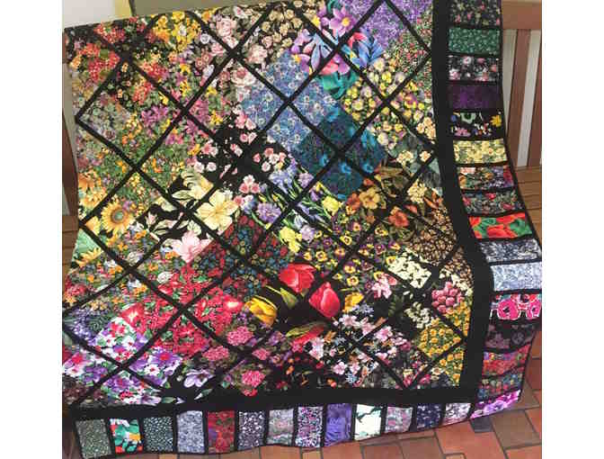 Handmade "attic windows" quilt. Black border with a variety of flower print fabrics. Approximately 86" square.