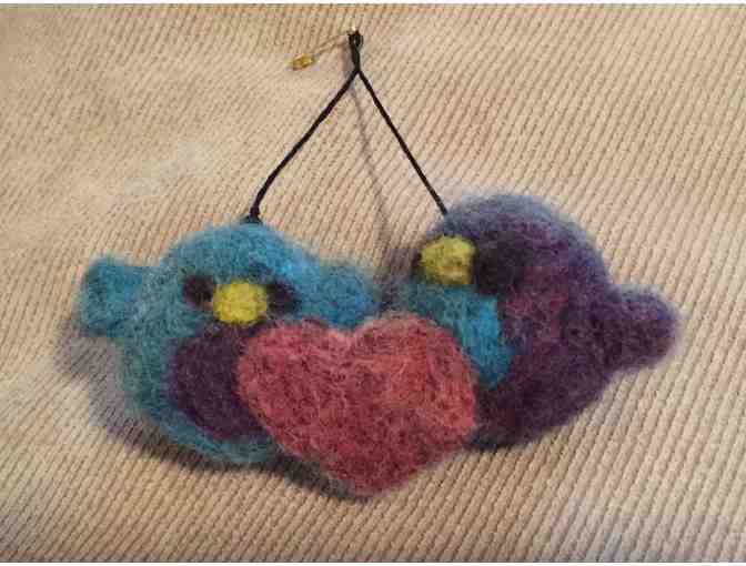 Enjoy a beautiful pair of felted love birds made by local artisan Eden Ertle. They will look similar to the pair pictured here.