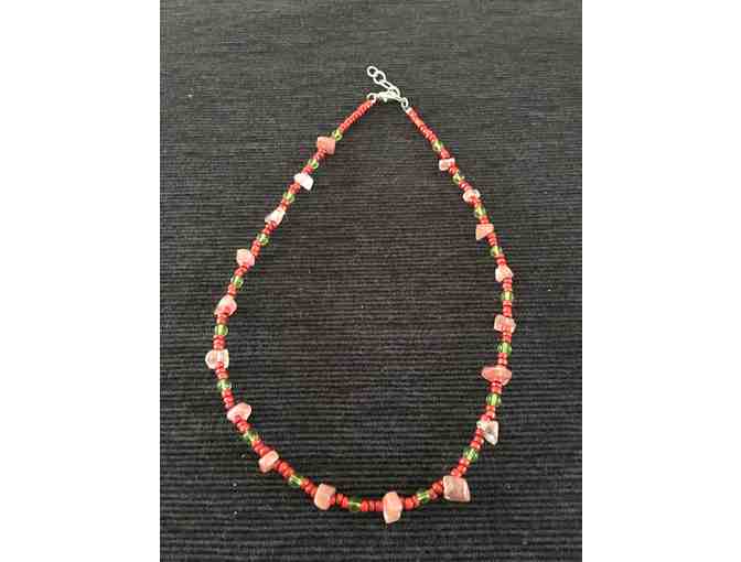 Beaded necklace made by Synergy Alum Nicolette Gamache. When unclasped necklace is ~16.5" long.