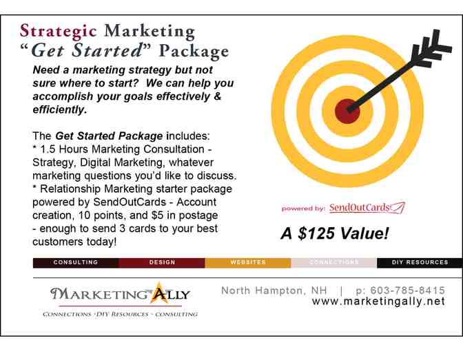 Need a marketing strategy but not sure where to start? We can help you accomplish your goals effectively & efficiently. The Get Started Package includes: * 1.5 Hours Marketing Consultation - Strategy, Digital Marketing, whatever marketing questions you’d like to discuss. * Relationship Marketing starter package powered by SendOutCards - Account creation, 10 points, and $5 in postage - enough to send 3 cards to your best customers today!