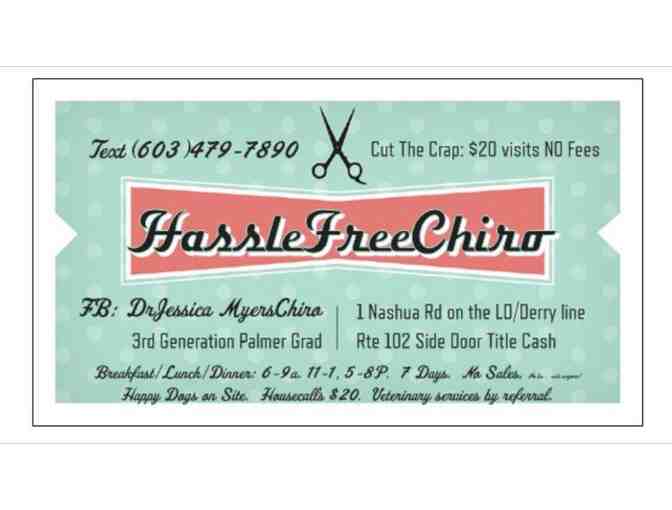 Five vouchers for one person or transferrable to anyone. Each card covers an intial visit or a follow-up adjustment. No exam fees at Hassle Free Chiro - $20 office visits. Available all 7 days, 6AM-9AM, 11AM-1PM, 5PM-8PM by online booking app "Mind & Body."