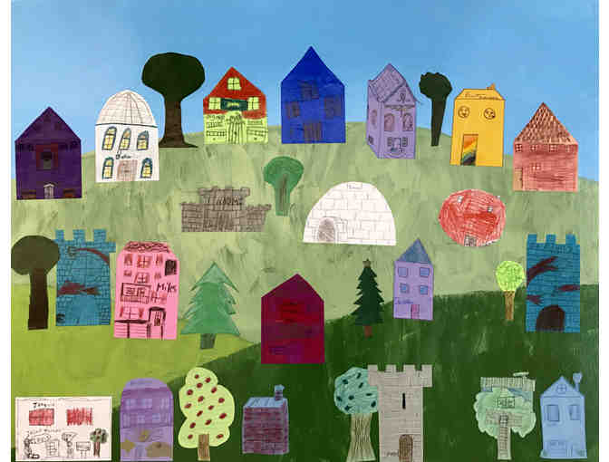 This year, the Eastenders and Skylights created villages. They chose a colored piece of paper, drew with colored pencil and trimmed the edges to make a building. Early finishers made trees. The buildings were glued to a simple background that I painted in acrylic. Several coats of varnish were added on top to seal all the pieces in. Please bid! These colorful works of art will give you joy for years to come. (Work is on display in the front hallway!)