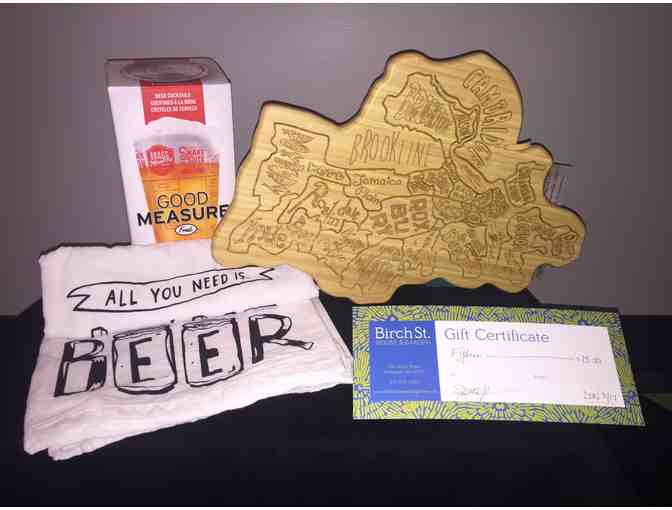 This item includes a Boston cutting board, pint size glass, $15 GC for Birch Street Home & Garden Boutique, kitchen towel