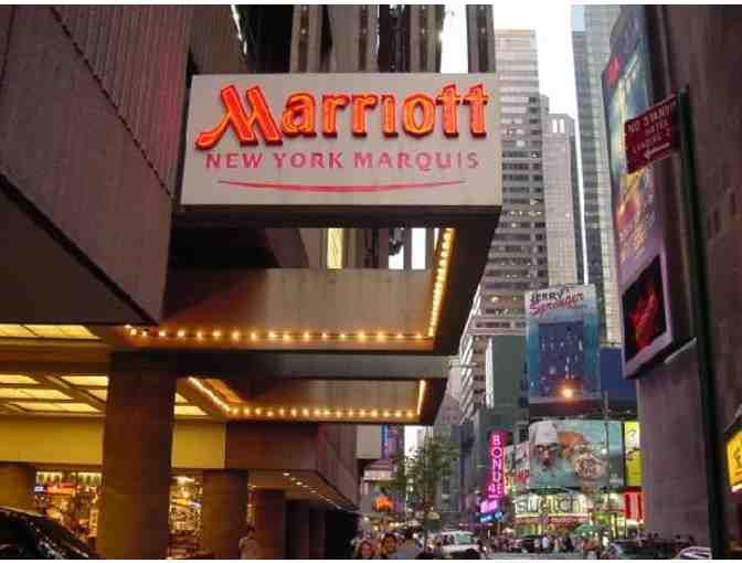 One night stay- Friday or Saturday - at the New York Marriott Marquis located in the heart of Times Square. Rising fifty stories above the lights of Broadway, this modern luxury hotel features a dramatic 37-floor atrium; New York's only revolving rooftop restaurant and lounge - The View, Crossroads American Kitchen and Bar, and the Broadway Lounge.