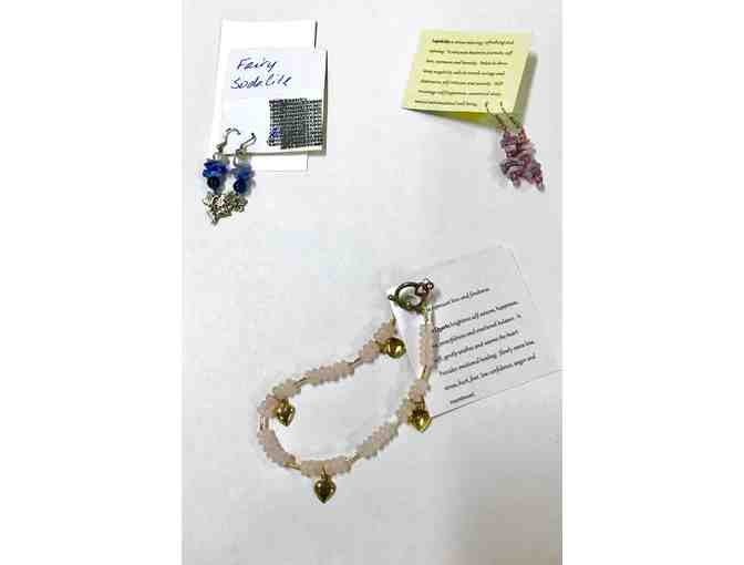 Rose Quartz Hearts bracelet, Fairy Sodalte earrings, ad Lepodolite Stone hanging.