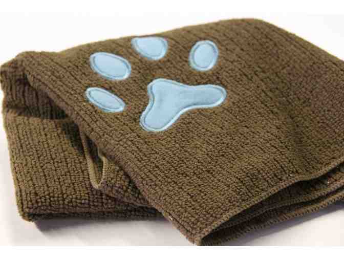 Brown, looped fiber bath towel with light blue paw print sewn in.