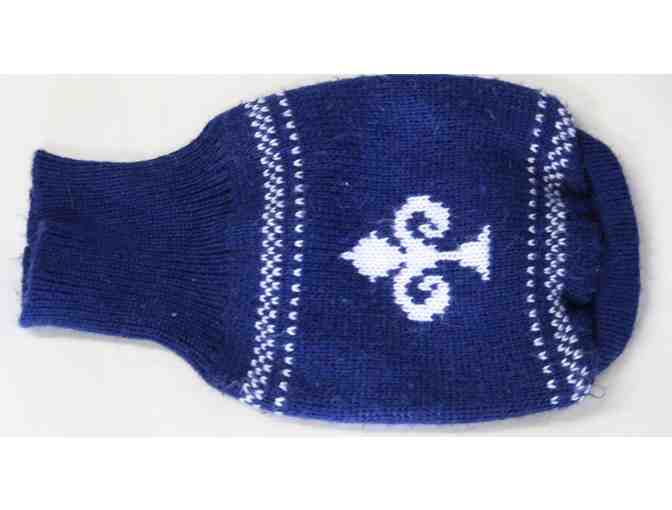 Blue, knitted turtleneck sweater featuring white checked and dotted borders with a "fleur de lis-like" design.