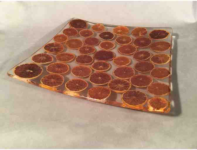 Beautiful and unique piece for serving and decoration created by artist Riccardo Marzi in Firenze, Italy. The artist is know for using natural elements, in this case orange slices, encased in food-safe resin to provide peices that provide a dazzling display of color and form. 13x14 inches, includes artist's seal.