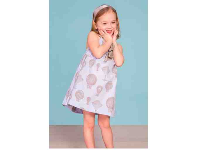 For the petit world traveler in her comes this lovely vintage hot air balloon sundress. The pale periwinkle and brown colors are chic and elegant, and the linen fabric and bow detail airy and perfect for warm weather celebrations. To complete her pretty look get her a chic pair of camel suede sandals with double lace-up ankle ties and a pale brown satin headband and she'll conquer the fashion world.