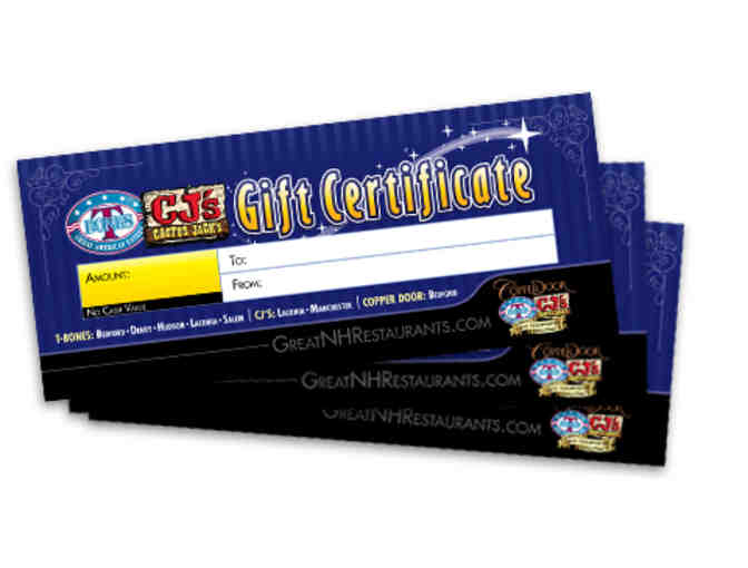 $25.00 Gift certificate to T-Bones Great American Eatery or CJ's (Cactus Jack's) Restaurant. Locations in Bedford, Derry, Hudson, Laconia, Salem, Laconia and Manchester, NH.