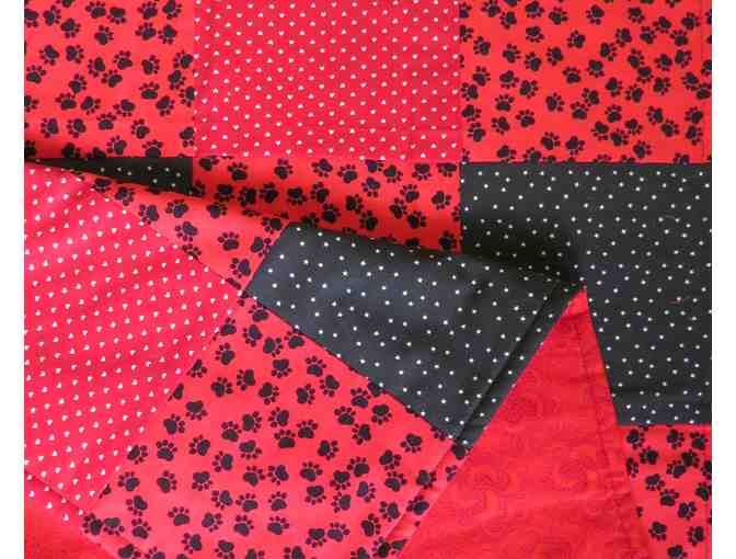 New, beautiful, handmade dog blanket/quilt. Measures approximately 34" x 34". Primarily red and black - features black squares with white stars, red squares with white hearts and red squares with black paw prints. Backside is solid red with red design. Red signifies determination and passion. Keep your dog warm and cozy with the reminder to stay determined and passionate about educating others of Harley's dream!