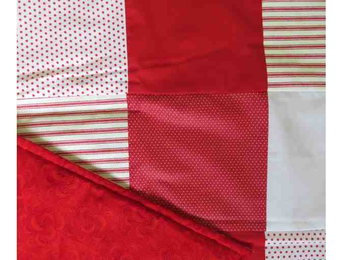 New, beautiful, handmade dog blanket/quilt. Measures approximately 34" x 34". Primarily red and white - features white squares with red polka dots, solid red squares, solid white squares, and white squares with red stripes. Backside is solid red with red design. Red signifies love. Show your dog he/she is loved and remember how much we love and are loved by Harley and Teddy!