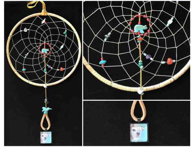 Handcrafted one-of-a-kind dreamcatcher. Decorated with blue and red natural beads, a blue hummingbird and most importantly a Harley charm! A dreamcatcher's purpose is to catch good dreams and send bad dreams away. What better way to promote Harley's Dream than with a dreamcatcher!