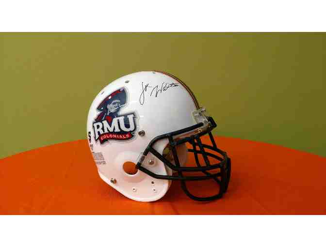 Autographed RMU Helmet by Former Pittsburgh Steeler 3 time Superbowl Champion #76 John Banaszak. John is the current Head coach of the RMU Colonials and a former Marine. The item is also autographed by former NY Jets Head Coach and RMU Head Coach Joe Walton.