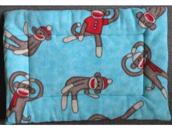 Small, handmade Sock Monkey print fleece pad. Reverses to solid brown fleece.