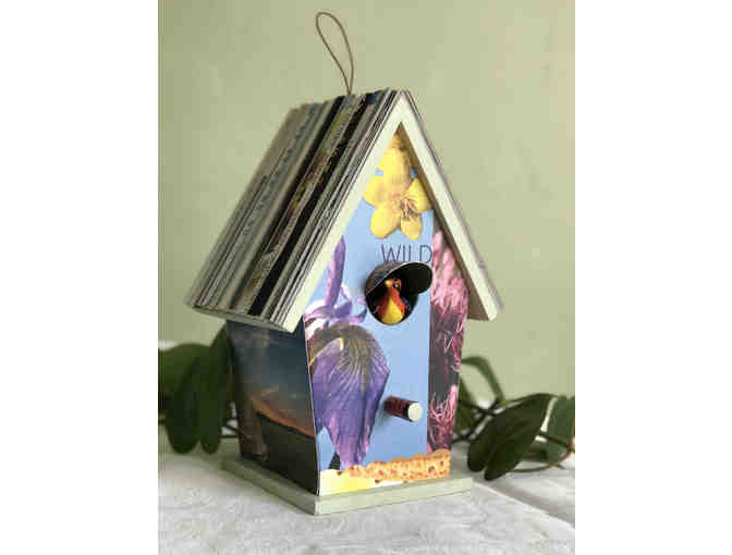 This whimsical wood birdhouse is collaged with recycled pages from Audubon magazine. The roof is covered with magazine spines and includes a loop for hanging. (size about 4.5 x 8”)