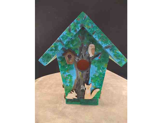 A classic birdhouse hand painted in nature lovers themes of the woods and forest. Lovingly applied mini woodland creatures decorate the house and share the forest with their bird friends.