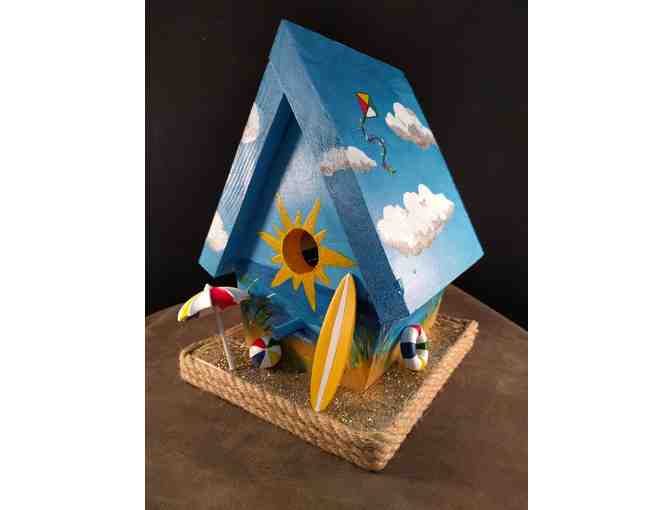 Handpainted birdhouse reminiscent of a sunny day at the beach. Fluffy clouds, sparkling sand and adorable mini beach ball and beach umbrella adorn this classic birdhouse.