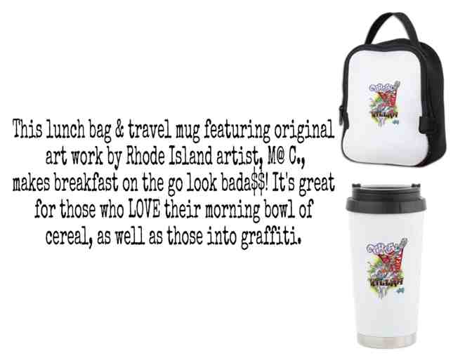 This lunch bag & travel mug featuring original art work by Rhode Island artist, M@ C., makes breakfast on the go look bada$$! It's great for those who LOVE their morning bowl of cereal, as well as those into graffiti.