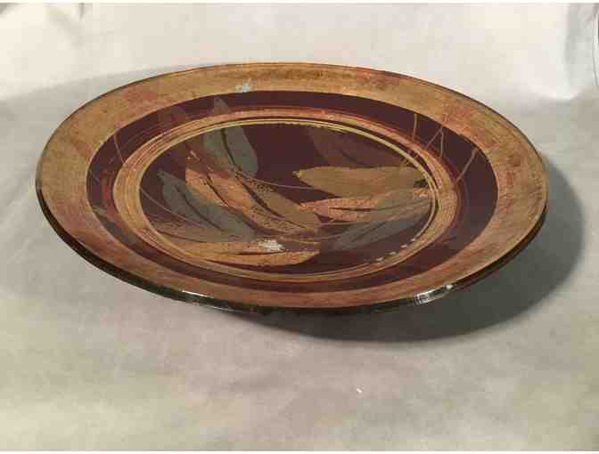 This decorative glass and metal bowl was created and signed by artist Noi. It is roughly 10" in diameter and has a shallow basin of almost 2" and features a nature theme with tan, green, and gold leaves.