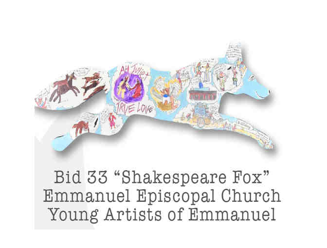 The Emmanuel young artists who painted the fox are: Jack Hannum (6th grade) Flora Hannum (4th grade) Nancy Alcock (11th grade) Sam Reed (1st grade) Sophia Reed (1st grade) “I dreamt one night, of taking flight. Away from the hounds I flew. The visions in my head sent me smoothly along, while happily singing my Shakespeare song”