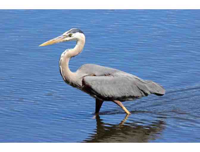 Framed photo. Photo is 14x11 inches. A great blue neighbor from our Sudbury conservation areas. Whether poised at a river bend or cruising the coastline with slow, deep wingbeats, the Great Blue Heron is a majestic sight. This stately heron with its subtle blue-gray plumage often stands motionless as it scans for prey or wades belly deep with long, deliberate steps. They may move slowly, but Great Blue Herons can strike like lightning to grab a fish or snap up a gopher. In flight, look for this widespread heron’s tucked-in neck and long legs trailing out behind.