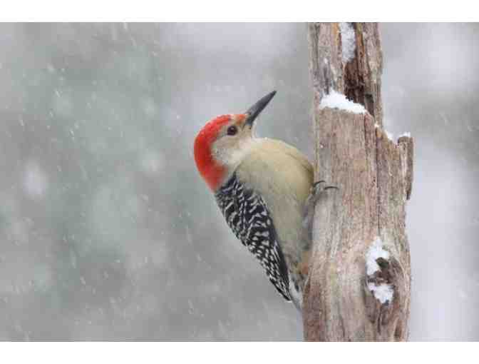 Framed photo. Photo is 14x11 inches. Red-bellied Woodpeckers are pale, medium-sized woodpeckers common in forests of the East. Their strikingly barred backs and gleaming red caps make them an unforgettable sight – just resist the temptation to call them Red-headed Woodpeckers, a somewhat rarer species that's mostly black on the back with big white wing patches.