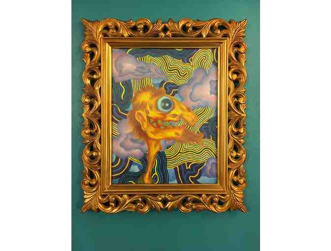 Framed in a gold thrift shop find, RI artist, M@ C. ( Matt Choiniere), brings you a wonderful drawing in colored pencil. What do you see? Is it a portrait? Or something spookier? Reach out to the artist to uncover the truth!