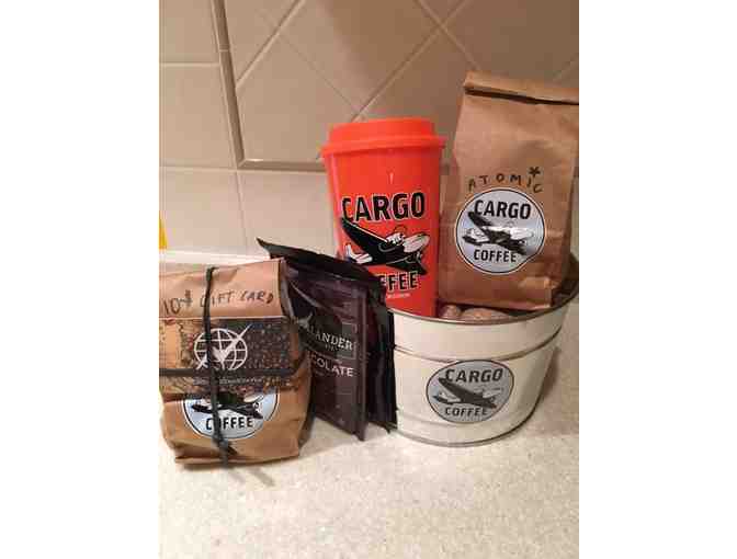 Gift Bucket includes 2 --1/2 lb. Bags of Cargo Coffee, Travel Mug, 2 Packs Hollander Cocoa Mix PLUS a $10 Gift Card.