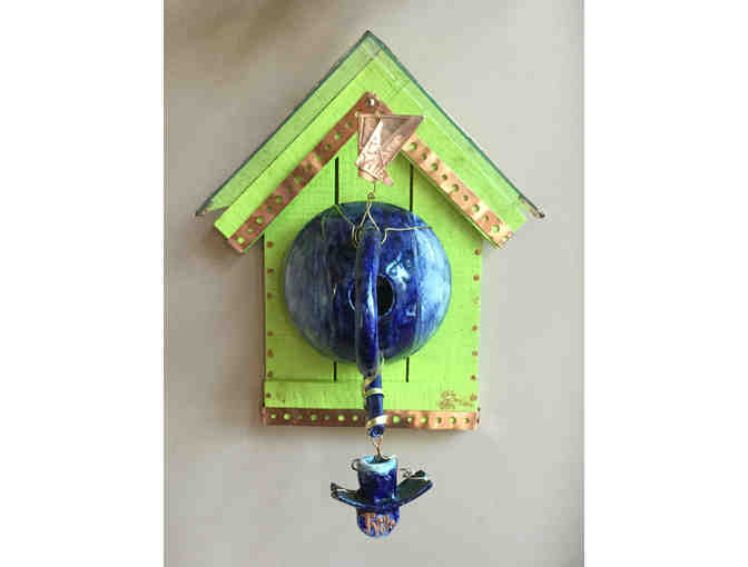 Once upon a time, there was a clay teapot hand designed by an artist who had a passion for pottery. The little teapot was not short and stout, but it was tipped over... and unique! The artist of this piece, Karin, transformed the teapot into "T-VILLA"- a one of a kind masterpiece of deep blues against a background of luscious lime green!