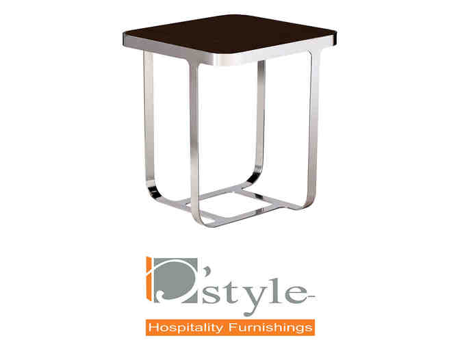 The Custom Stockholm End Table by D’style Hospitality Furnishings features an espresso laminate top and a contemporary base in polished stainless steel.