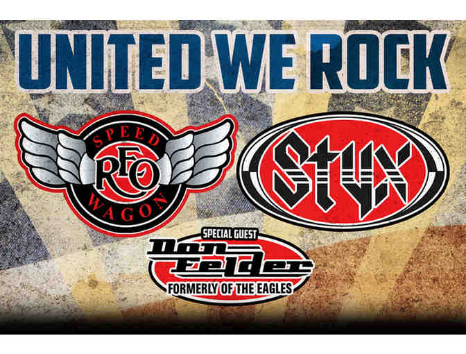 Rock legends REO SPEEDWAGON and STYX, along with very special guest star DON FELDER—formerly of the Eagles—will join forces for the “United We Rock” U.S. summer tour. You'll receive 2 tickets for 7pm Saturday, June 24 at the Greek Theatre. You'll be seated in Section A, Row Q, Seats 17 and 19.