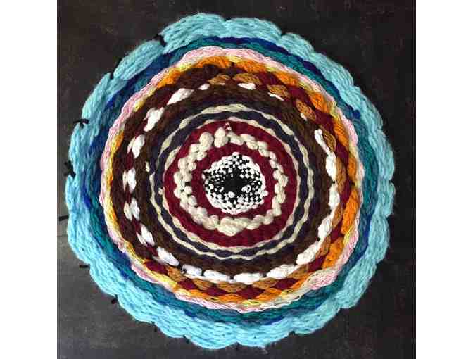 Description: Finger yarn knitting woven into a cozy 36" diameter decorative rug. Knitted by Kevin Snaith, Lily McKissick, Emma Hamblett, Harper Henderson, Alice McConnell, Lila Fox, Isaia Rasmussen and Claudia Slaughter.