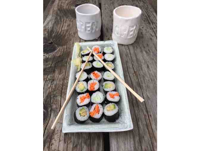 Hand built white clay decorated with food safe glaze, the sushi platter and two tumblers were created by Open Classroom students Dillon Cavagnaro, Jocelyn Feickert, Bridget Goodwin, Dyami Mason, Mussadiqua, Safa Al-Jamal, Emily Goodwin, Simone Franco and Ruby Enclade.