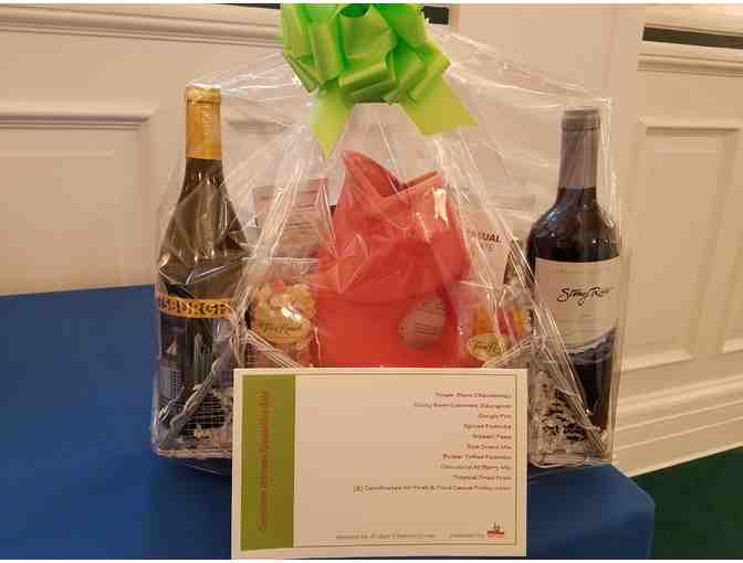 A wine basket with a Gurgle Pot (This is a pitcher, shaped like a fish, which makes a gurgling sound when pouring, 2 bottles of wine and snacks and tickets for a complimentary tasting/wine class at Dreadnought Wines