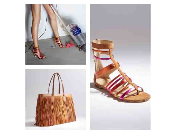 Turrell Heel (displayed in the editorial image with the vacuum): Bold details and bright metallic accents make this day-to-night sandal a warm weather statement.