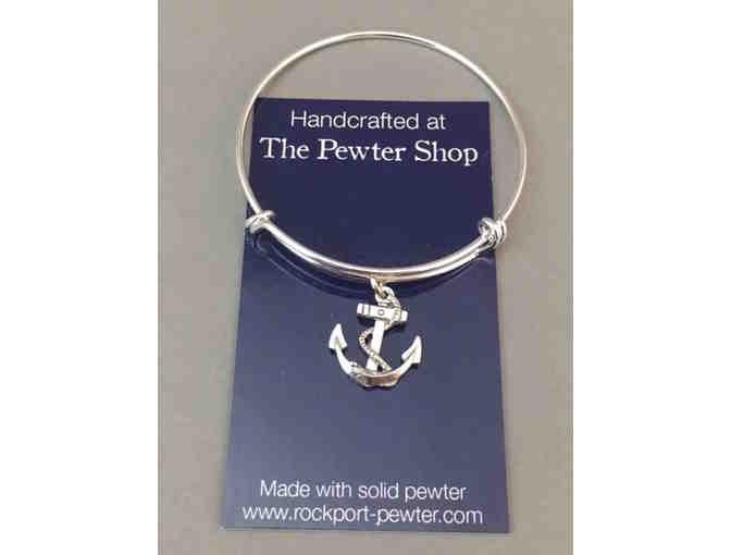 This beautiful anchor bracelet was handcrafted in the workshop of the Pewter Shop on Bearskin Neck in Rockport. Pewter doesn't tarnish like silver, so it will stay bright and beautiful!