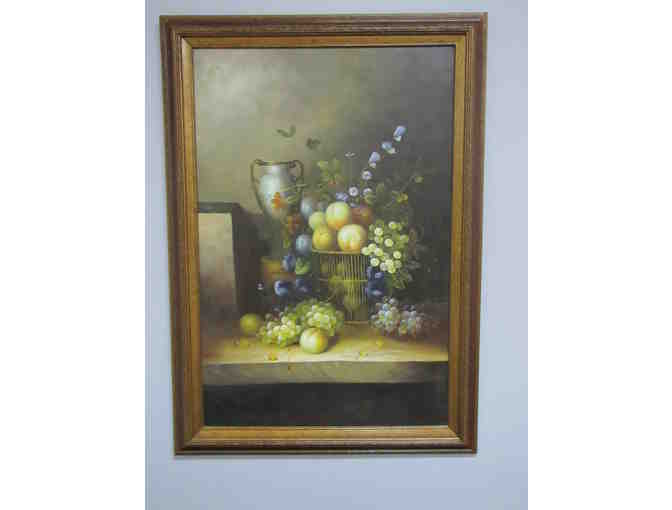 This beautiful framed painted art canvas. The vase, setting, and fruit have beautiful colors. Frame measures 29.5 inches wide by 41.5 inches long