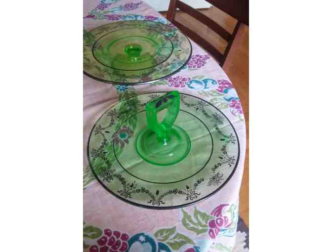 Two matching antique vaseline glass plates with silver plate details. One cake plate, one pastry plate. No nicks, chips, or cracks! Perfect condition with a lovely silver patina.