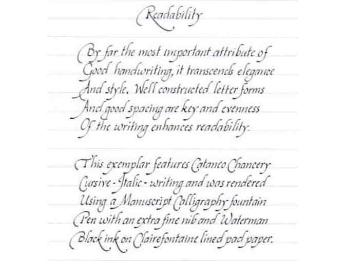 Here is your chance to learn the art of calligraphy with a one-hour calligraphy lesson for two people. Get started learning to create beautiful notes, cards, and invitations! Participants will be taught calligraphy in the italics style. Each participant will be provided with a calligraphy marker and a practice booklet.