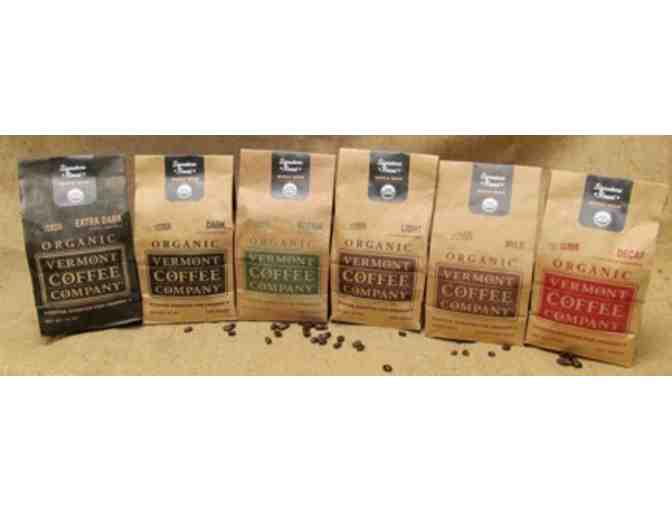 Enjoy a sampler box of four different coffees from the Vermont Coffee Company! Vermont Coffee Company has perfected its method of slow-roasting small batches of organic coffee for a big and bold flavor. This is a four pack sampler with one 8oz package each of Dark, Medium, Light, and Decaf coffee.