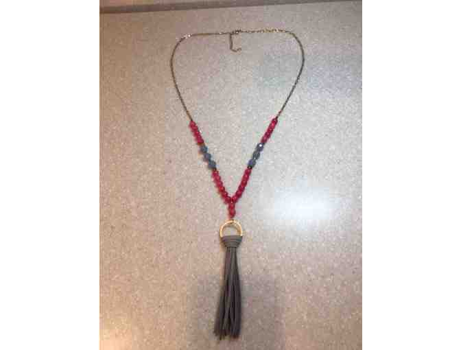 Pink and Blue Stone Long Necklace with Grey Leather Tassle and Gold Chain