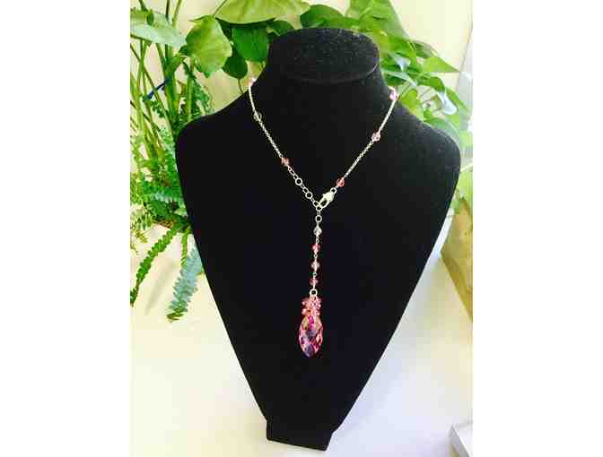 Pink Swarovski Crystal Drop necklace with small round Swarovski connected with sterling silver chain.